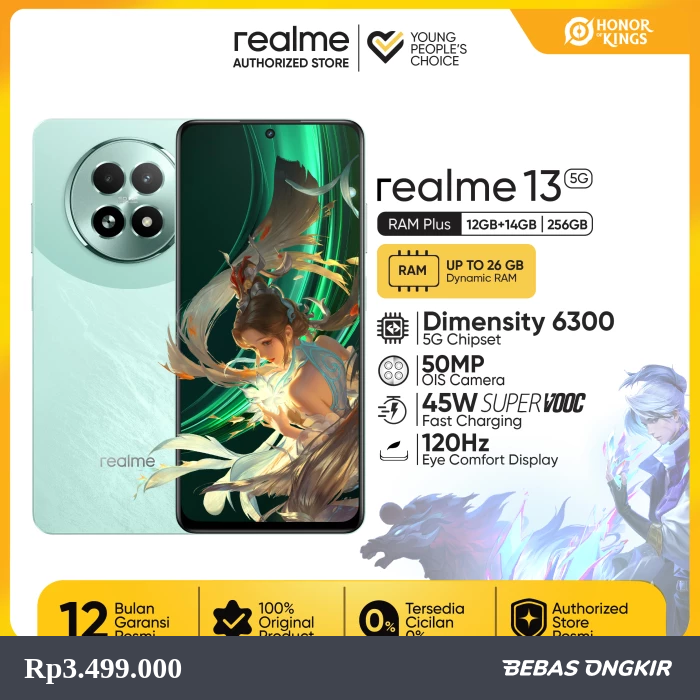 realme 13 5G 12+14*GB / 256GB (Prosesor 5G Dimensity 6300 | Pendingin VC Stainless Steel | 45W Fast Charge | Gaming Lancar 120Hz Display) - Speed Green